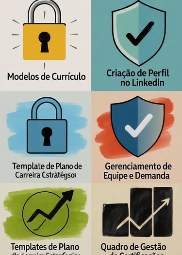 Currículum ● Elaboração de perfil no LinkedIn ● Plano Estratégico de Carreira ● Plano de Carreira ● Planner de Certificações ● Dashboard para gestão de times e demandas